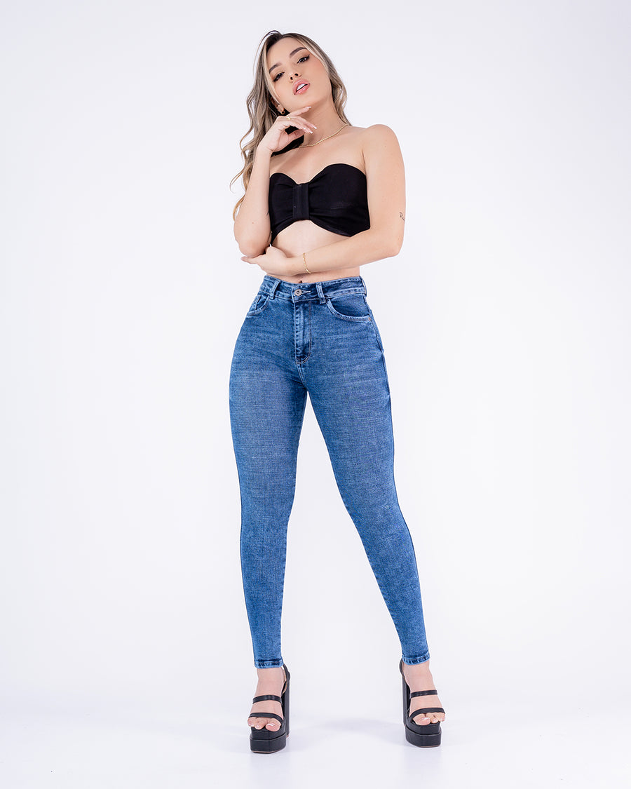Pantalón jean skinny tiro alto diseñado para realzar tu figura con tecnología levantacola que moldea y define tu figura. Confeccionado en tela stretch de alta elasticidad, se adapta perfectamente a tu cuerpo proporcionando comodidad sin sacrificar el ajuste. El corte...